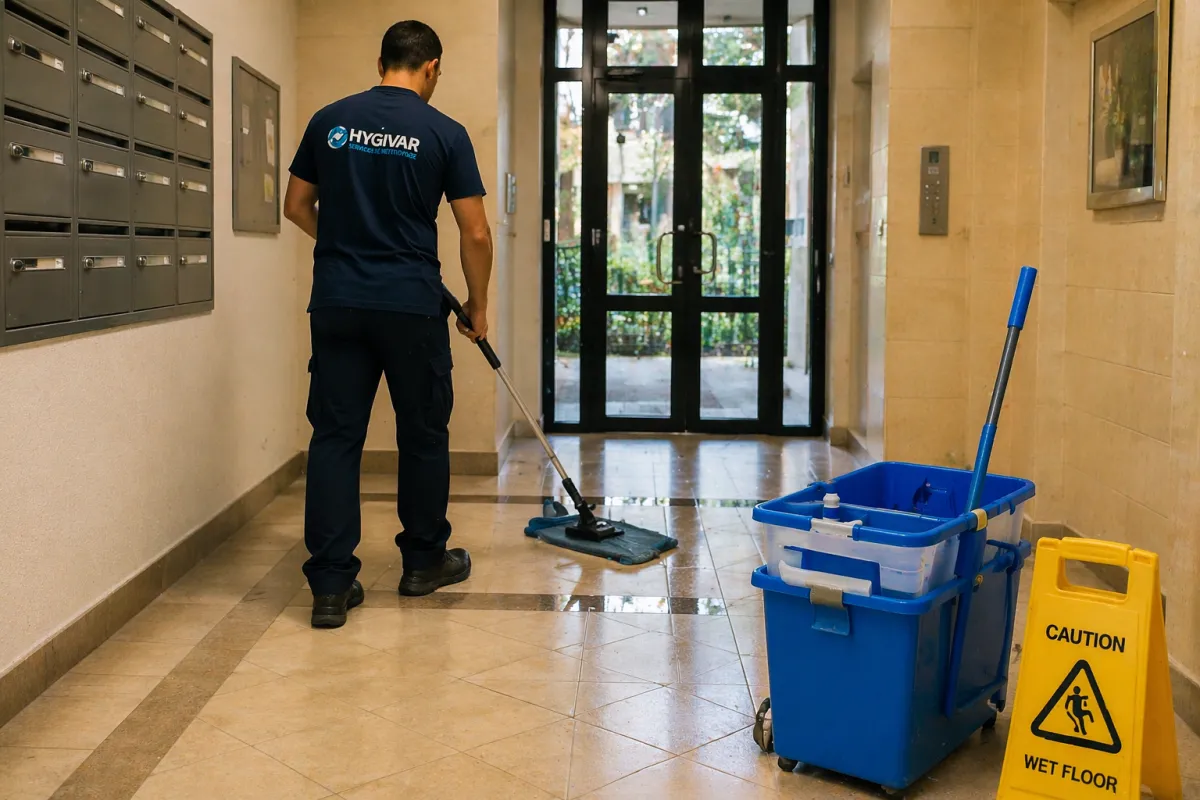 Entretien d’immeuble et copropriété avec nettoyage des parties communes, escaliers et halls d’entrée.