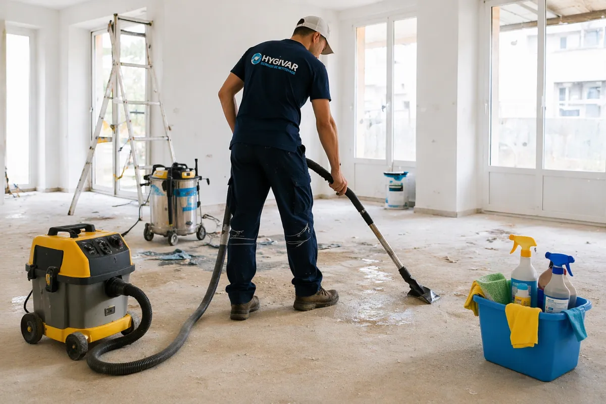 Nettoyage complet après travaux : élimination des poussières, nettoyage des surfaces, vitres et sols pour une remise en état impeccable avant livraison.